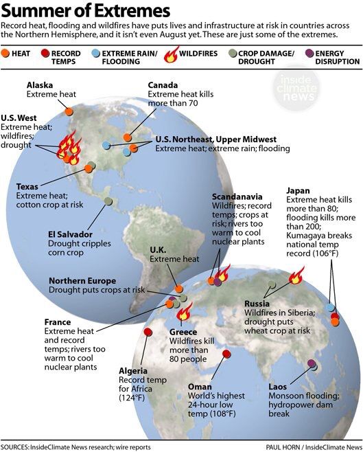 UAE: 51.4°C, Africa + Algeria: 51.3°C, Tunisia: 49.2°C, LA: 48.9°C, Baku: 42.7°C, Yerevan : 42.4°C, Japan: 41.1°C, Kabul: 40.5°C, Tbilisi: 40.5°C, Montreal: 36.6°C, Lapland: 33.4°C, Swedish polar circle: 32.5°C, Baltic Sea: 25°C’